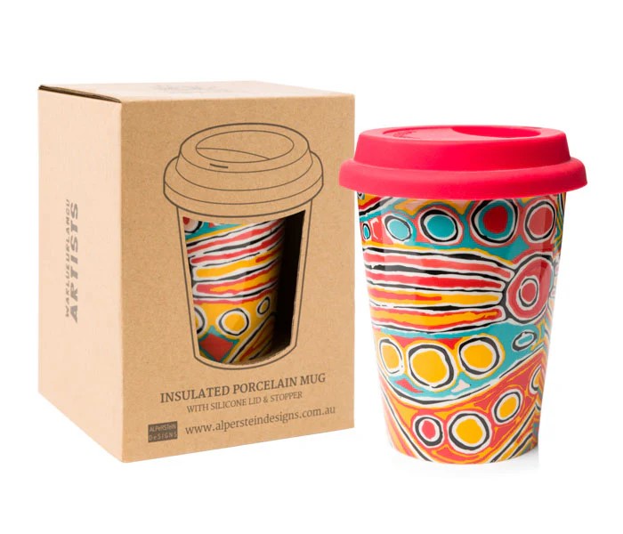 These insulated porcelain mugs featuring artwork by Aboriginal Artists.
