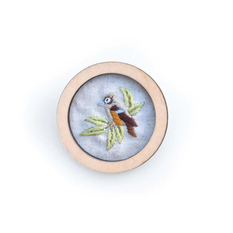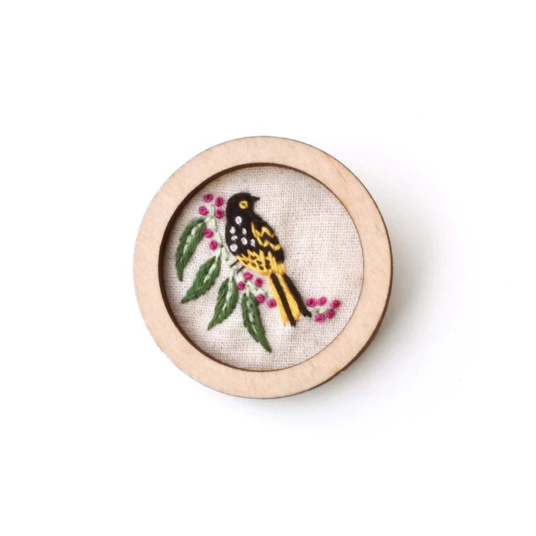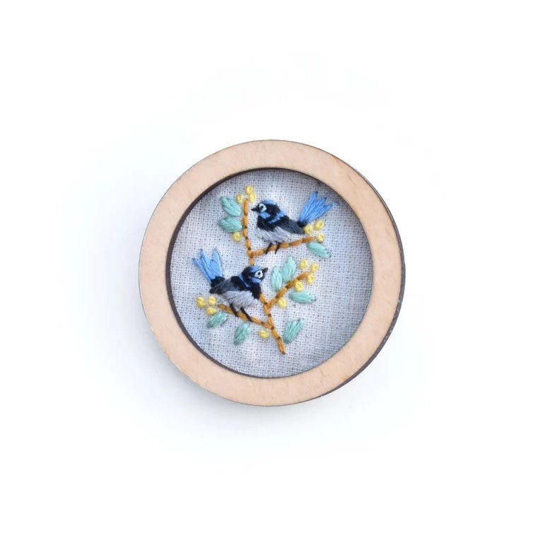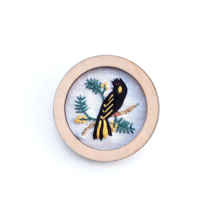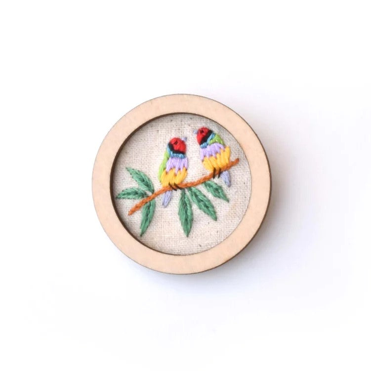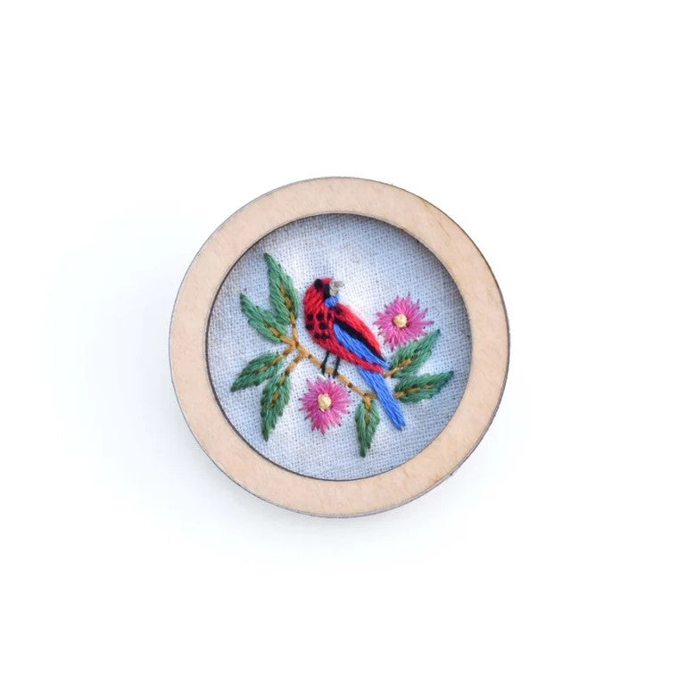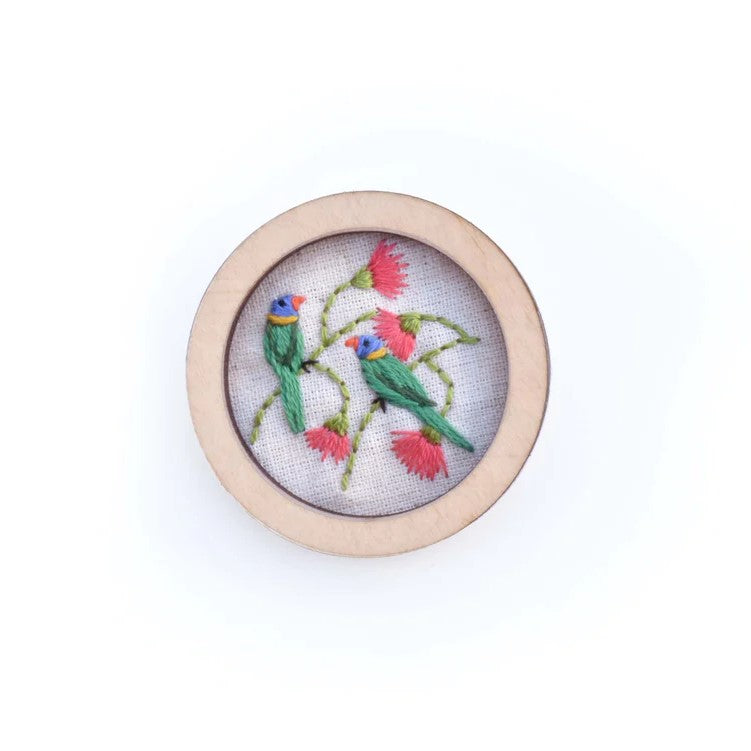 Yarn IndustriesDiscover the beauty of Australian-made, handmade art with Emma's exquisite embroidered creations. Each piece, showcasing intricate designs of stunning Australian birds and flora, is framed in a round, fine timber frame, combining elegance and masterful craftsmanship. This versatile accessory can be worn as a brooch or transformed into a necklace with its built-in clasp.
