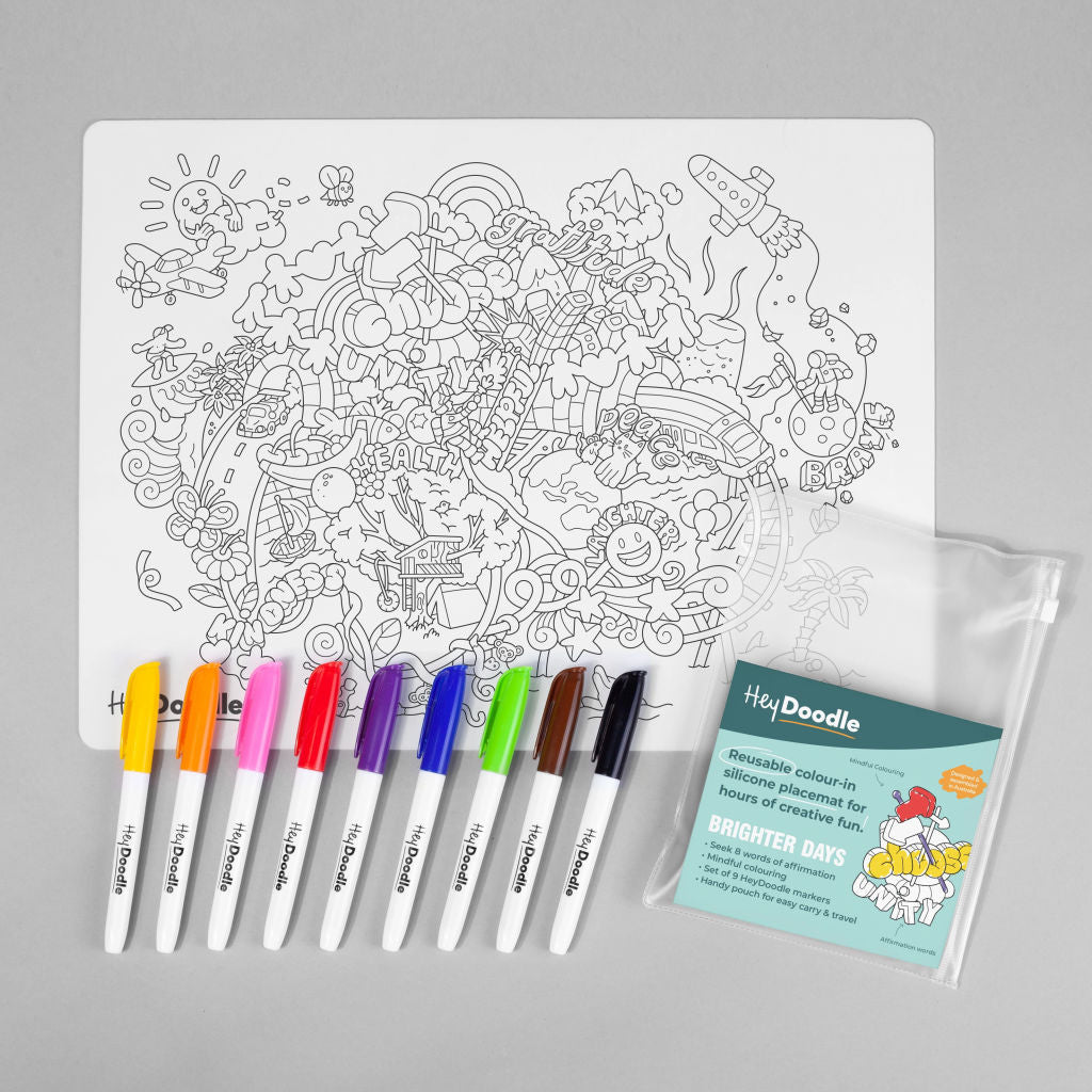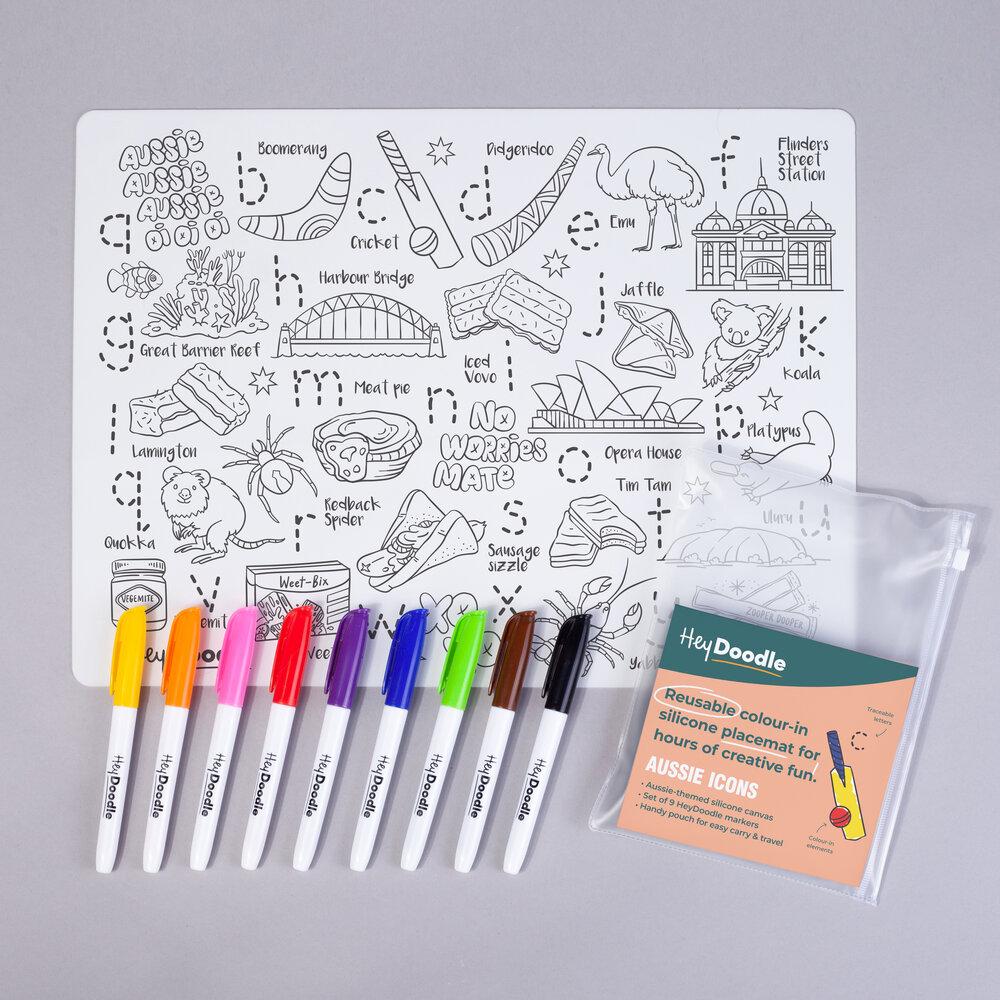 Each pack includes 1 large HeyDoodle silicone drawing mat, 9 Markers and a travel pouch.
