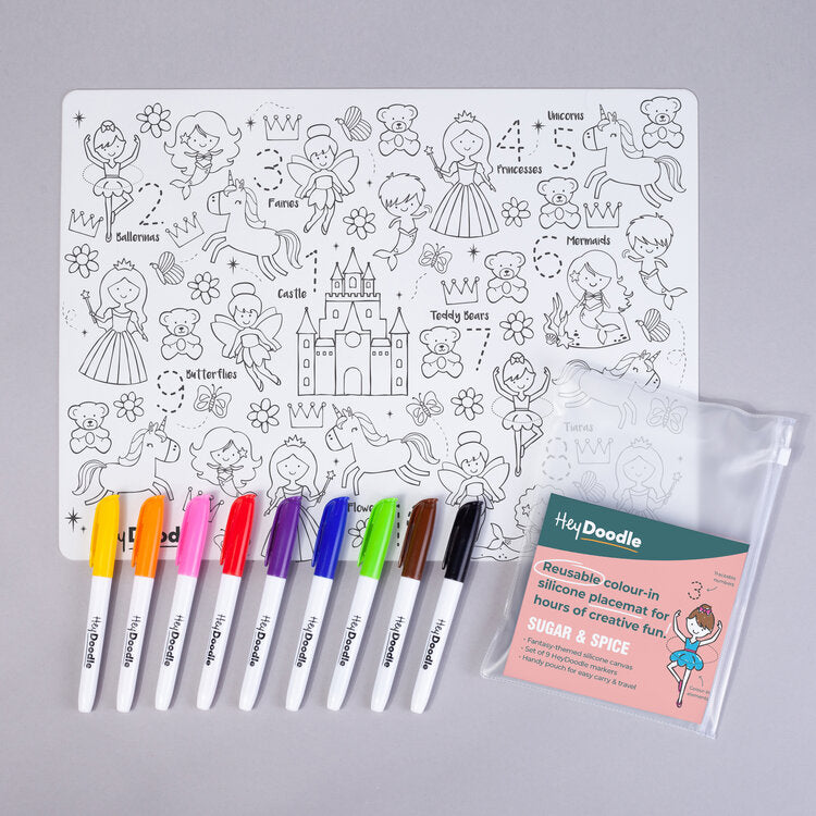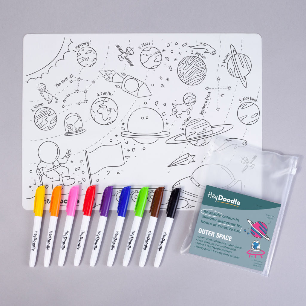 HeyDoodleFun reusable silocone drawing mats by HeyDoodle. Colour in the fun shapes and items with your 9 coloured markers and then do it all again by simply wipeing clean. Perfect for keeping the kids occupied for ages