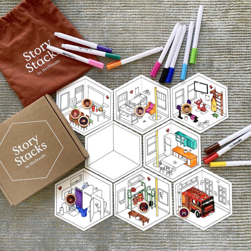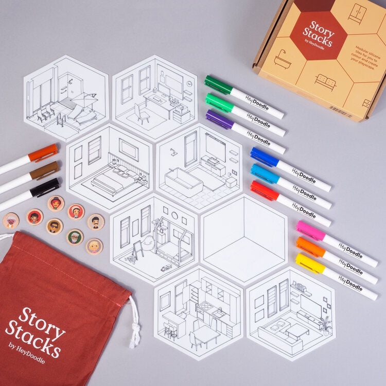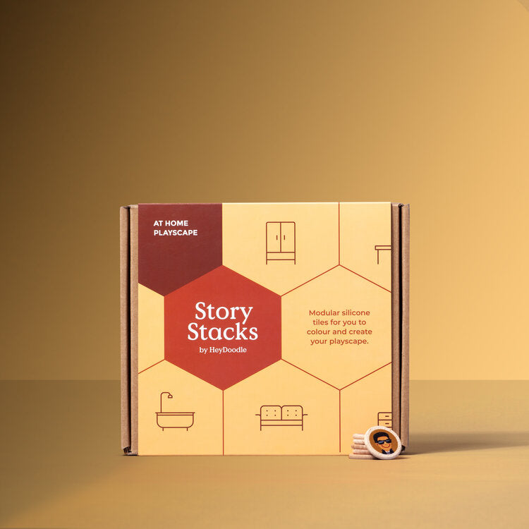 HeyDoodleStoryStacks is a product by HeyDoodle. An innovative take on the traditional doll house, this is one you can take with you anywhere you go. Each silicone tile represents a room in the house or fire station, teaching children to visualise space in 3D and fostering a sense of creative designing. Double sided character tokens allow for deeper storylines as they write a narrative around these characters.