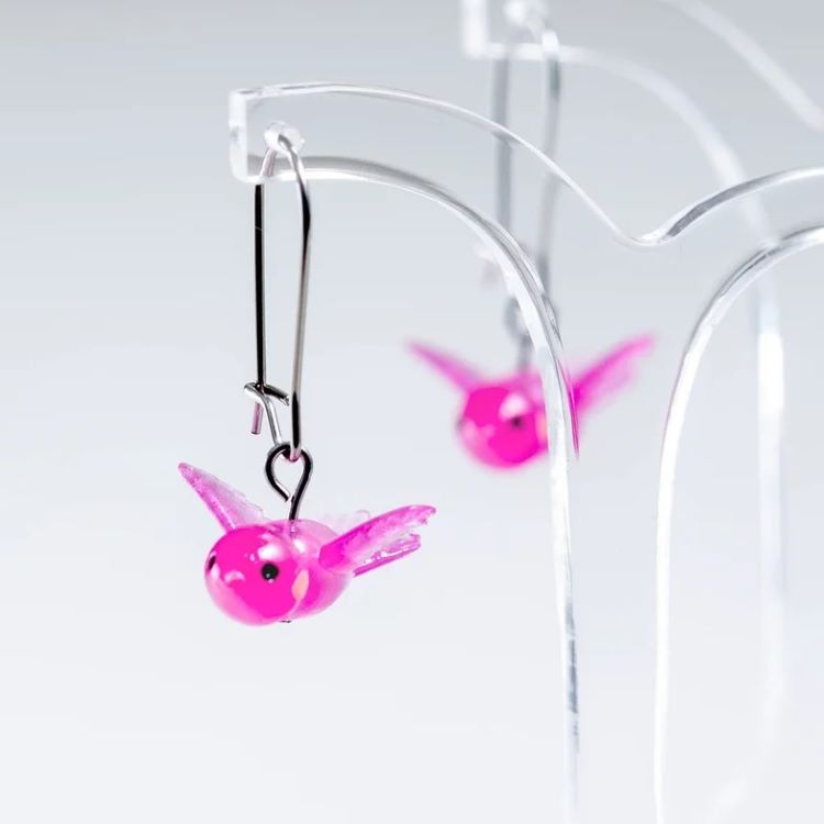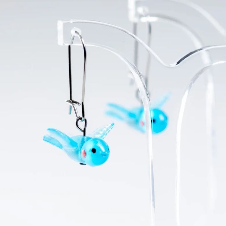 Claire has done a beautiful job creating these gorgeous lucky bird earrings! Available in Fairy wren blue or playful pink. Each earring features a unique 3D-printed translucent resin bird with hand-painted eyes and cheeks bringing to life her original little bird drawings.