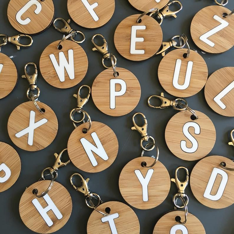 Bamboo keyring/bag tag with an acrylic letter. The tag is 50mm in diameter and approximately 5mm thick (excluding the keychain).